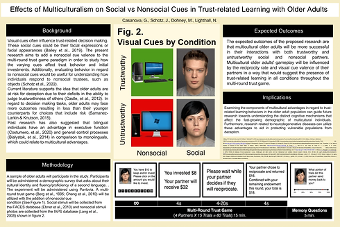 I decided to complete my Honors Undergraduate Thesis (HUT) within The Adult Development and Decision Lab. My HUT is currently titled, "Investigating Susceptibility and Trust in Older Adults with Cultural Differences". I plan to research trust behavior and scam susceptibility in older adults with normal aging and those at risk of developing Alzheimer's disease. This research is funded by grants from the NIH and FDOH.